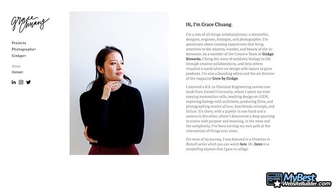 gracechuang.me popüler fotoğrafçılık sitelerinden biri. Sol tarafa arayüzü ortaya da site hakkında temel bilgiyer yerleştirilmiş. Kusursuz bir tasarıma sahip. Hem güzel görünüyor hem de sorunsuz çalışıyor.